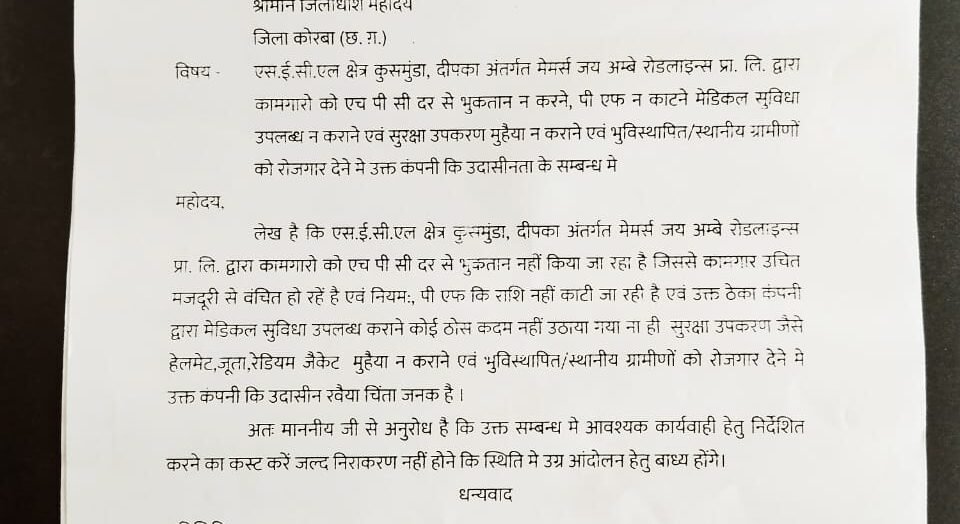 *एस.ई.सी.एल कुसमुंडा,दीपका क्षेत्र मे मेमर्स जय अम्बे रोडलाइन्स द्वारा कामगारो को एच पी सी दर , पी एफ मेडिकल सुविधा, नहीं देने पर युवा कांग्रेस द्वारा जिलाधीश को सौंपा गया पत्र* युवा कांग्रेस कटघोरा द्वारा उपाध्यक्ष दीपेश यादव के नेतृत्व मे जिलाधीश कोरबा को पत्र सौंपा गया एवं बताया गया कि एस.ई.सी.एल क्षेत्र कुसमुंडा, दीपका […]