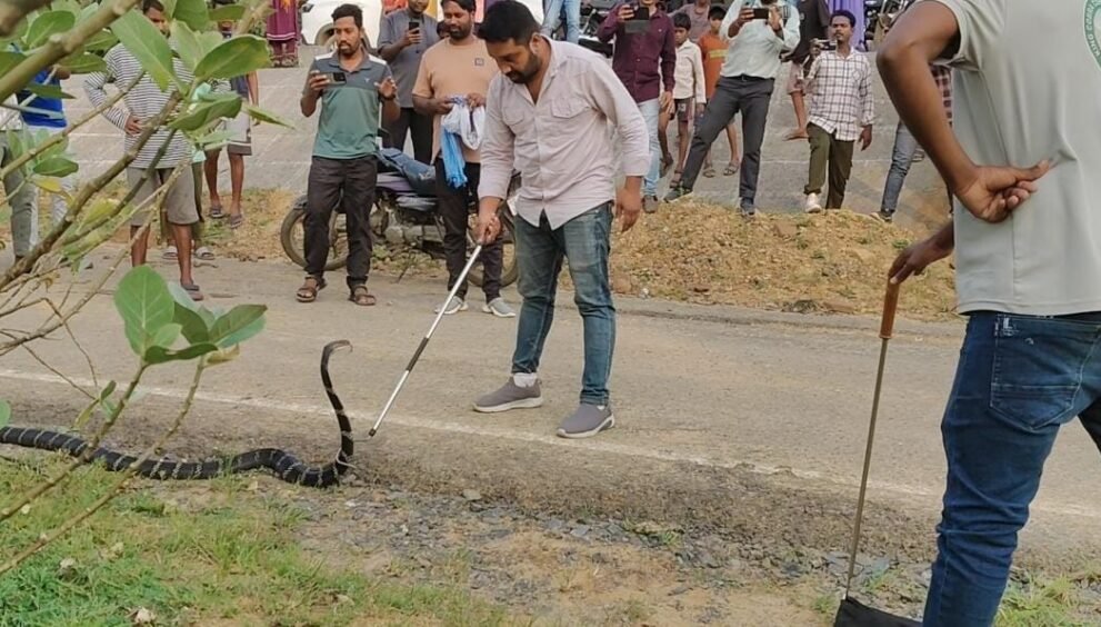 (Blueink.in)कोरबा जिला अपनी समृद्ध जैव-विविधता और दुर्लभ वन्यजीवों के लिए जाना जाता है। यहां कई बार ऐसे जीव देखने को मिलते हैं जिनसे आम लोग चकित रह जाते हैं। इसी कड़ी में जिले के अजगरबाहर गांव में एक ऐसी घटना घटी , जिसमें मानव और जीवों के बीच प्रेम भावना दिखी, दरअसल कोरबा जिले के सतरेंगा पर्यटन स्थल से लौट रहे कुछ पर्यटको की नजर अजगरबहार गांव के पास एक 10 फीट का किंग कोबरा रोड पार कर ही रहा था उस पर पड़ी और पर्यटकों ने तत्काल गाड़ी रोक दी,देखते ही देखते भीड़ इकट्ठा हो गई वही किंग कोबरा रोड पार न कर के डर से एक किनारे एक छोटी सी झाड़ी में छुप कर बैठ गया, लोगों में देखने की जिज्ञासा से लगातार भीड़ बढ़ने लगा किंग कोबरा एवं लोगों की सुरक्षा को ध्यान में रखते हुए,घटना की जानकारी तत्काल वन विभाग और नोवा नेचर वेलफेयर सोसायटी की टीम को दी गई। सूचना मिलते ही रेस्क्यूअर जितेंद्र सारथी ने मामले की जानकारी डीएफओ श्री कुमार निशांत को दिया फिर उनके निर्देशानुसार और एसडीओ आशीष खेलवार एवं सुर्यकांत सोनी के मार्गदर्शन में जितेंद्र सारथी अपनी टीम के साथ तुरंत उस स्थान के लिए रवाना हुए। गांव पहुंचने के बाद सबसे पहले पर्यटकों एवं ग्रामीणों को सुरक्षित दूरी पर किया गया और फिर तय प्रोटोकॉल के तहत रेस्क्यू अभियान शुरू किया गया।
