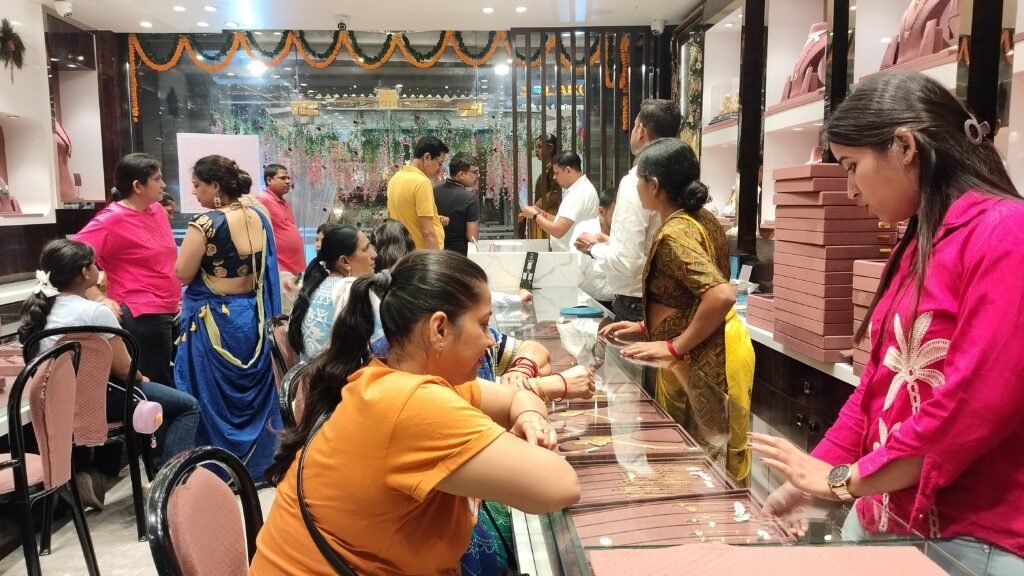 धनतेरस पर सोने और चांदी की दुकानों में खरीदारों की भीड़ दिनभर बनी रही। ज्वेलरी शोरूम्स में शुभ मुहूर्त के दौरान ग्राहकों की लंबी लाइनें लगी थीं। लोग अपनी सामर्थ्य के अनुसार सोने की अंगूठी, चेन, चांदी के सिक्के और बर्तन खरीदते नजर आए। सर्राफा कारोबारियों के मुताबिक, पिछले वर्ष की तुलना में इस बार लगभग 20 प्रतिशत अधिक बिक्री दर्ज की गई।