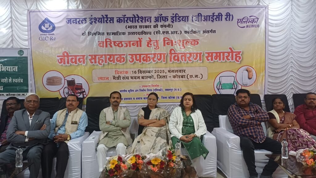 ( blueink.in) कोरबा 16 दिसंबर 2025. मैत्री संघ भवन, बालको नगर में जनरल इंश्योरेंस कॉरपोरेशन ऑफ इंडिया के नियमित सामाजिक उत्तरदायित्व (CSR) कार्यक्रम के अंतर्गत वरिष्ठ जनों के लिए निःशुल्क जीवन सहायक उपकरण वितरण समारोह का भव्य आयोजन किया गया।