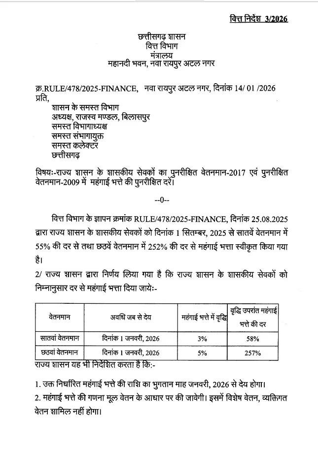 रायपुर 14 जनवरी 2026। राज्य सरकार ने कर्मचारियों का महंगाई भत्ता बढ़ा दिया है। मुख्यमंत्री ने रविवार को डीए में तीन प्रतिशत की बढ़ोत्तरी का ऐलान किया था। जिसके बाद अब वित्त विभाग ने आदेश जारी कर दिया है। हालांकि कर्मचारियों को एरियर्स की राशि नहीं मिलेगी। 1 जनवरी से सातवें वेतनमान में 58 प्रतिशत महंगाई भत्ता का लाभ मिलेगा। वहीं छठवें वेतनमान मे 5 प्रतिशत महंगाई भत्ता की बढोत्तरी हुई है। अब छठवें वेतनमान में 252 से बढ़कर 257 प्रतिशत डीए दी जायेगी।